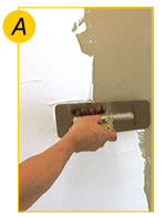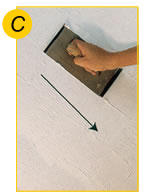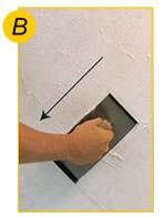 1- Aplique a Textura na cor desejada como uma massa em uma camada não muito grossa (aprox. 2mm de espessura) com o auxílio da desempenadeira em uma faixa vertical de aproximadamente 80cm de largura (fig. A).